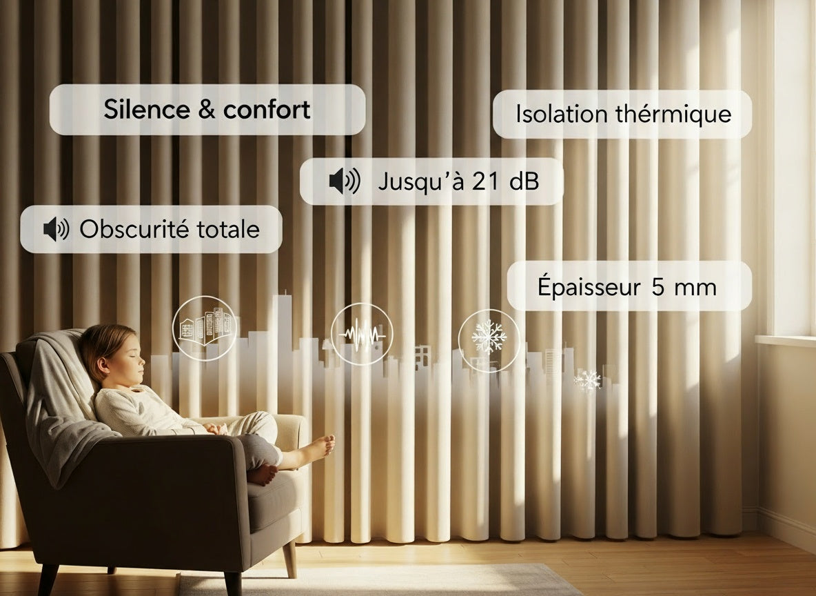 Dieser isolierende Vorhang schränkt die Nutzung von Heizungen oder Klimaanlagen ein. Das Ergebnis: ein besserer Geräuschkomfort, niedrigere Rechnungen und eine echte langfristige Einsparung bei optimierten Kosten.